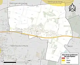 Le retrait-gonflement des sols argileux est susceptible d'engendrer des dommages importants aux bâtiments en cas d’alternance de périodes de sécheresse et de pluie. 1,7 % de la superficie communale est en aléa moyen ou fort (54,2 % au niveau départemental et 48,5 % au niveau national). Sur les 370 bâtiments dénombrés sur la commune en 2019, aucun n'est en aléa moyen ou fort, à comparer aux 57 % au niveau départemental et 54 % au niveau national. Une cartographie de l'exposition du territoire national au retrait gonflement des sols argileux est disponible sur le site du BRGM[13],[Carte 2].