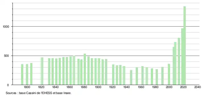 L'évolution du nombre d'habitants est connue à travers les recensements de la population effectués dans la commune depuis 1793. Pour les communes de moins de 10 000 habitants, une enquête de recensement portant sur toute la population est réalisée tous les cinq ans, les populations légales des années intermédiaires étant quant à elles estimées par interpolation ou extrapolation[17]. Pour la commune, le premier recensement exhaustif entrant dans le cadre du nouveau dispositif a été réalisé en 2008[18].