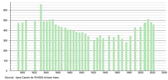 L'évolution du nombre d'habitants est connue à travers les recensements de la population effectués dans la commune depuis 1793. Pour les communes de moins de 10 000 habitants, une enquête de recensement portant sur toute la population est réalisée tous les cinq ans, les populations légales des années intermédiaires étant quant à elles estimées par interpolation ou extrapolation[26]. Pour la commune, le premier recensement exhaustif entrant dans le cadre du nouveau dispositif a été réalisé en 2007[27].