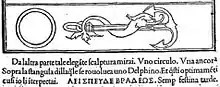 - L'ancre et le dauphin. Le motif apparaît pour la première fois au revers d'une monnaie de l'empereur Titus. Il est généralement interprété par les numismates comme une référence à Neptune[11]. Cette représentation se trouve à nouveau dans le Songe de Poliphile. Elle a été adoptée comme marque d'imprimeur par Alde Manuce, le premier éditeur de cette œuvre en 1499.
