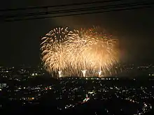- On peut voir les feux d'artifice, non seulement à Tondabayashi mais aussi depuis les villes voisines d'Ōsakasayama, Kawachinagano Sakai et Habikino. Par-dessus tout, la gigantesque bombe Star Mine (8000 fusées)[2] à la fin sonne comme un grondement de la terre et illumine tout le quartier comme la lumière du jour pendant quelques secondes.