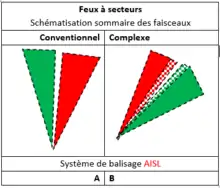 Le feu à secteurs comporte généralement un secteur lumineux blanc qui désigne la zone libre de dangers et des secteurs lumineux rouge et vert, généralement fixes, qui désignent les secteurs dangereux (rouge à bâbord de la zone saine, vert à tribord; l'inverse dans la zone B du balisage international). Si le bateau s'écarte de la zone des eaux saines, le signal lumineux devient selon le cas rouge ou vert permettant d'effectuer la correction dans la bonne direction. Le feu à secteurs est une alternative à un balisage plus coûteux consistant à placer des bouées lumineuses tout au long du chenal. Dans certains lieux de navigation (chenal non rectiligne, ...), le navire doit parfois suivre successivement plusieurs feux à secteur.