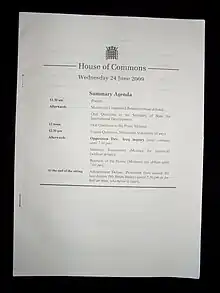 - (en) Cet article est partiellement ou en totalité issu de l’article de Wikipédia en anglais intitulé « Order Paper » (voir la liste des auteurs).