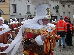 Lors du cortège du dimanche après-midi, les Gilles lancent des oranges vers la foule des spectateurs