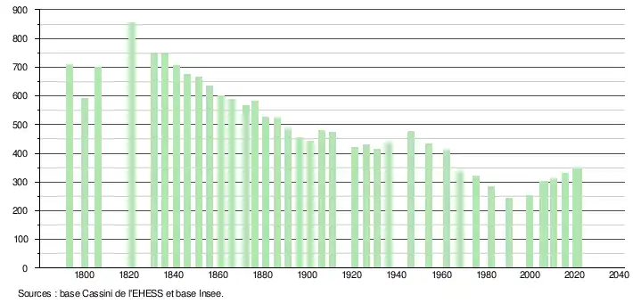 L'évolution du nombre d'habitants est connue à travers les recensements de la population effectués dans la commune depuis 1793. Pour les communes de moins de 10 000 habitants, une enquête de recensement portant sur toute la population est réalisée tous les cinq ans, les populations légales des années intermédiaires étant quant à elles estimées par interpolation ou extrapolation[36]. Pour la commune, le premier recensement exhaustif entrant dans le cadre du nouveau dispositif a été réalisé en 2005[37].