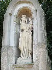 - Vierge à l'Enfant du XIVe siècle avec des traces de polychromie, dans une niche, sur la place de l'église. La statue provenant de l'église, placée ici en 1858, est classée au titre objet aux monuments historiques[50].