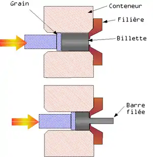La billette (cylindre plein de métal) de métal préalablement chauffée est placée dans le conteneur. Un poinçon exerce une poussée. Le métal est d'abord plaqué contre la filière et file à travers elle en prenant sa forme définitive.