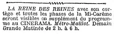 - - Film no 156 : La Reine des Reines (50 secondes) Le défilé du cortège de la Reine des Reines sur les Grands Boulevards[2].