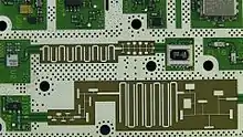 ![]() Le circuit imprimé à l'intérieur d'un analyseur de spectre Agilent N9344C de 20 GHz montrant divers éléments de la technologie des filtres à éléments distribués en microruban. |