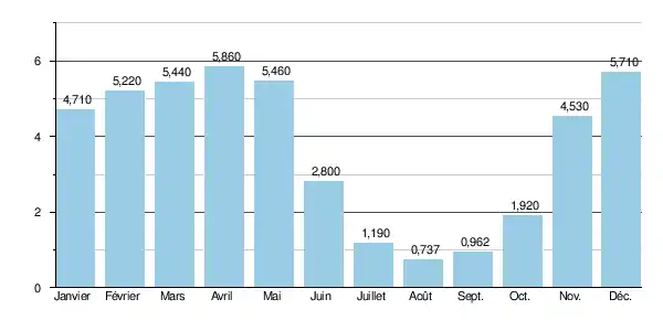 Sur cette période d'observation, le débit journalier maximal a été observé le pour 164,0 m3/s. Le débit instantané maximal a été observé le [note 14] avec 530,0 m3/s en même temps que la hauteur maximale instantanée de 8 290 mm soit 8,29 m[2].