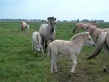 - le Brunblakk est la robe la plus répandue. Elle tire sur le brun clair (avec des variations allant d'une teinte crème foncé à une teinte alezan clair) et contient beaucoup de crins sombres. Les marques primitives sont foncées. C'est la robe qui correspond génétiquement au bai, dilué par le gène dun. Elle représente 85-90 % du cheptel[55] ;