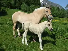- enfin, le Gulblakk est la robe la plus rare. Le cheval est quasiment crème avec de rares crins bruns. C'est génétiquement une robe de base alezane modifiée par le gène dun et un gène de dilution crème supplémentaire[51]. Les crins peuvent être complètement blancs et les marques primitives indistinctes[47]. Elle correspond à 0,5 % du cheptell[55].