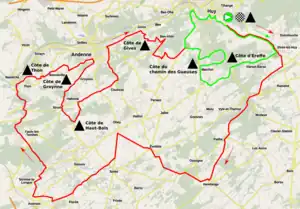 Le parcours revient à une version proche de celle d'avant 2013. Il se dirige tout d'abord vers Havelange en empruntant la montée de Pailhe. Il continue ensuite vers l'ouest avec la montée de la côte de Thon. Il se rend ensuite à Andenne. Les côtes de Groynne et de Haut-Bois sont certes montées mais dans une direction inédite. De manière similaire, la côte de Gives est escaladée pour la première fois alors qu'elle a été descendue à de nombreuses reprises dans les éditions précédentes. Le circuit final est par contre identique à 2020, avec la côte d'Ereffe, du chemin des Gueuses et le mur de Huy.
