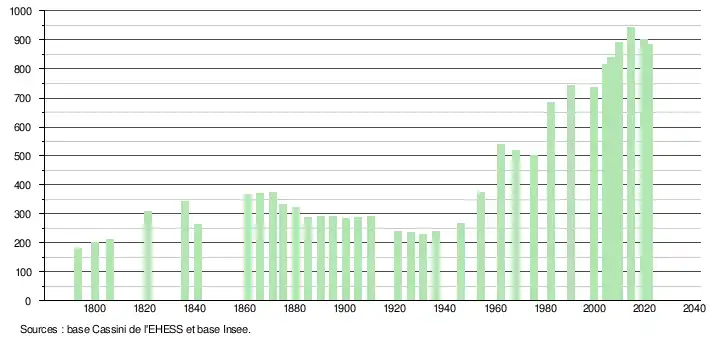 L'évolution du nombre d'habitants est connue à travers les recensements de la population effectués dans la commune depuis 1793. Pour les communes de moins de 10 000 habitants, une enquête de recensement portant sur toute la population est réalisée tous les cinq ans, les populations légales des années intermédiaires étant quant à elles estimées par interpolation ou extrapolation[22]. Pour la commune, le premier recensement exhaustif entrant dans le cadre du nouveau dispositif a été réalisé en 2004[23].
