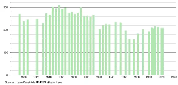 L'évolution du nombre d'habitants est connue à travers les recensements de la population effectués dans la commune depuis 1793. Pour les communes de moins de 10 000 habitants, une enquête de recensement portant sur toute la population est réalisée tous les cinq ans, les populations légales des années intermédiaires étant quant à elles estimées par interpolation ou extrapolation[20]. Pour la commune, le premier recensement exhaustif entrant dans le cadre du nouveau dispositif a été réalisé en 2004[21].