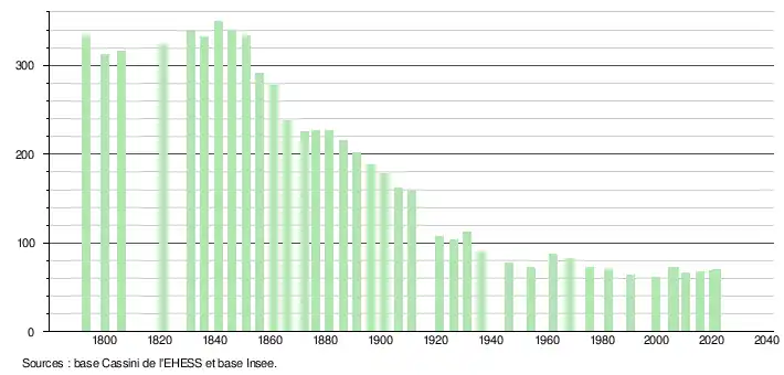 L'évolution du nombre d'habitants est connue à travers les recensements de la population effectués dans la commune depuis 1793. Pour les communes de moins de 10 000 habitants, une enquête de recensement portant sur toute la population est réalisée tous les cinq ans, les populations légales des années intermédiaires étant quant à elles estimées par interpolation ou extrapolation[17]. Pour la commune, le premier recensement exhaustif entrant dans le cadre du nouveau dispositif a été réalisé en 2005[18].