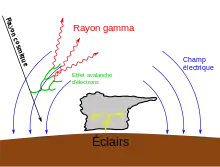 Les flashs de rayons gamma terrestres sont probablement causés par une émission Bremsstrahlung produit par une avalanche d'électrons runaways relativites (en) accélérés par des champs électriques intenses produits au-dessus ou à l'intérieur de certains orages[1].