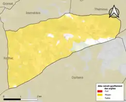 Le retrait-gonflement des sols argileux est susceptible d'engendrer des dommages importants aux bâtiments en cas d’alternance de périodes de sécheresse et de pluie. 91,9 % de la superficie communale est en aléa moyen ou fort (67,7 % au niveau départemental et 48,5 % au niveau national). Sur les 77 bâtiments dénombrés sur la commune en 2019, 68 sont en aléa moyen ou fort, soit 88 %, à comparer aux 72 % au niveau départemental et 54 % au niveau national. Une cartographie de l'exposition du territoire national au retrait gonflement des sols argileux est disponible sur le site du BRGM[25],[Carte 2].