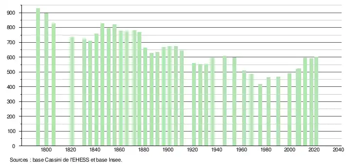 L'évolution du nombre d'habitants est connue à travers les recensements de la population effectués dans la commune depuis 1793. Pour les communes de moins de 10 000 habitants, une enquête de recensement portant sur toute la population est réalisée tous les cinq ans, les populations légales des années intermédiaires étant quant à elles estimées par interpolation ou extrapolation[22]. Pour la commune, le premier recensement exhaustif entrant dans le cadre du nouveau dispositif a été réalisé en 2007[23].