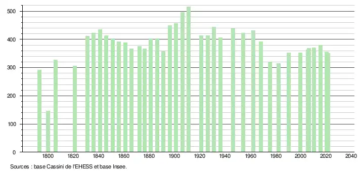 L'évolution du nombre d'habitants est connue à travers les recensements de la population effectués dans la commune depuis 1793. Pour les communes de moins de 10 000 habitants, une enquête de recensement portant sur toute la population est réalisée tous les cinq ans, les populations légales des années intermédiaires étant quant à elles estimées par interpolation ou extrapolation[29]. Pour la commune, le premier recensement exhaustif entrant dans le cadre du nouveau dispositif a été réalisé en 2005[30].