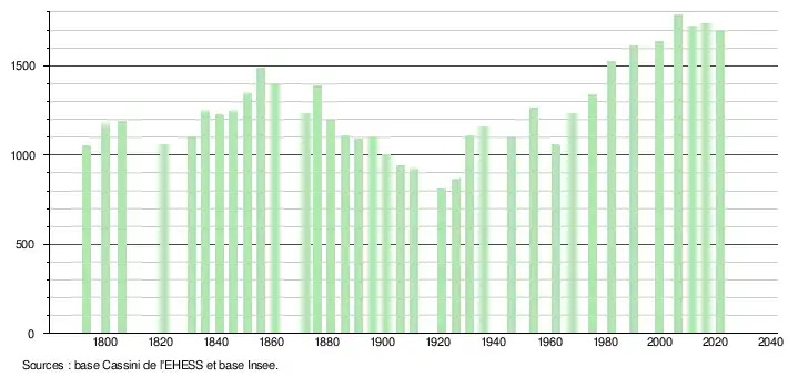 L'évolution du nombre d'habitants est connue à travers les recensements de la population effectués dans la commune depuis 1793. Pour les communes de moins de 10 000 habitants, une enquête de recensement portant sur toute la population est réalisée tous les cinq ans, les populations légales des années intermédiaires étant quant à elles estimées par interpolation ou extrapolation[20]. Pour la commune, le premier recensement exhaustif entrant dans le cadre du nouveau dispositif a été réalisé en 2006[21].