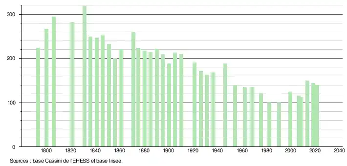 L'évolution du nombre d'habitants est connue à travers les recensements de la population effectués dans la commune depuis 1793. Pour les communes de moins de 10 000 habitants, une enquête de recensement portant sur toute la population est réalisée tous les cinq ans, les populations légales des années intermédiaires étant quant à elles estimées par interpolation ou extrapolation[15]. Pour la commune, le premier recensement exhaustif entrant dans le cadre du nouveau dispositif a été réalisé en 2008[16].