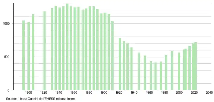 L'évolution du nombre d'habitants est connue à travers les recensements de la population effectués dans la commune depuis 1793. Pour les communes de moins de 10 000 habitants, une enquête de recensement portant sur toute la population est réalisée tous les cinq ans, les populations légales des années intermédiaires étant quant à elles estimées par interpolation ou extrapolation[16]. Pour la commune, le premier recensement exhaustif entrant dans le cadre du nouveau dispositif a été réalisé en 2008[17].