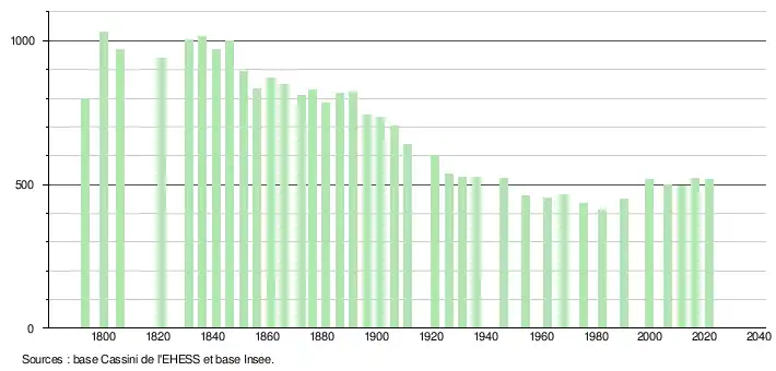 L'évolution du nombre d'habitants est connue à travers les recensements de la population effectués dans la commune depuis 1793. Pour les communes de moins de 10 000 habitants, une enquête de recensement portant sur toute la population est réalisée tous les cinq ans, les populations légales des années intermédiaires étant quant à elles estimées par interpolation ou extrapolation[19]. Pour la commune, le premier recensement exhaustif entrant dans le cadre du nouveau dispositif a été réalisé en 2006[20].