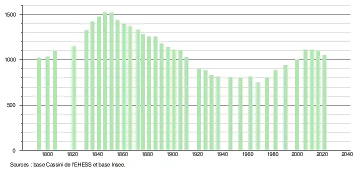 L'évolution du nombre d'habitants est connue à travers les recensements de la population effectués dans la commune depuis 1793. Pour les communes de moins de 10 000 habitants, une enquête de recensement portant sur toute la population est réalisée tous les cinq ans, les populations légales des années intermédiaires étant quant à elles estimées par interpolation ou extrapolation[15]. Pour la commune, le premier recensement exhaustif entrant dans le cadre du nouveau dispositif a été réalisé en 2006[16].