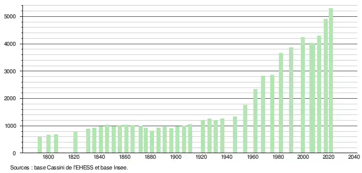 L'évolution du nombre d'habitants est connue à travers les recensements de la population effectués dans la commune depuis 1793. Pour les communes de moins de 10 000 habitants, une enquête de recensement portant sur toute la population est réalisée tous les cinq ans, les populations légales des années intermédiaires étant quant à elles estimées par interpolation ou extrapolation[41]. Pour la commune, le premier recensement exhaustif entrant dans le cadre du nouveau dispositif a été réalisé en 2007[42].