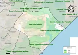 • la « basse plaine viticole de l'Aude » (1 438 ha), couvrant 4 communes dont 2 dans l'Aude et 2 dans l'Hérault[25] ;
