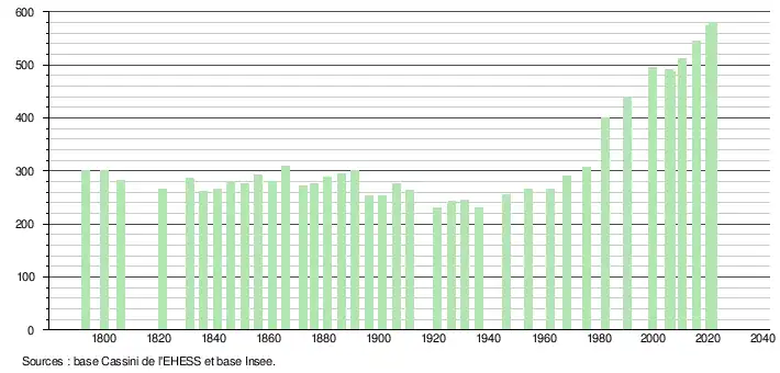 L'évolution du nombre d'habitants est connue à travers les recensements de la population effectués dans la commune depuis 1793. Pour les communes de moins de 10 000 habitants, une enquête de recensement portant sur toute la population est réalisée tous les cinq ans, les populations légales des années intermédiaires étant quant à elles estimées par interpolation ou extrapolation[22]. Pour la commune, le premier recensement exhaustif entrant dans le cadre du nouveau dispositif a été réalisé en 2005[23].