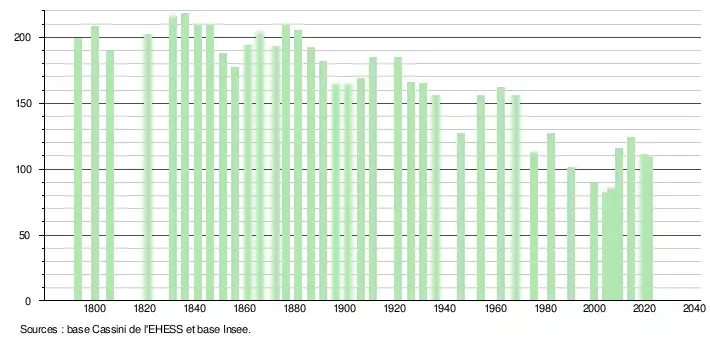 L'évolution du nombre d'habitants est connue à travers les recensements de la population effectués dans la commune depuis 1793. Pour les communes de moins de 10 000 habitants, une enquête de recensement portant sur toute la population est réalisée tous les cinq ans, les populations légales des années intermédiaires étant quant à elles estimées par interpolation ou extrapolation[40]. Pour la commune, le premier recensement exhaustif entrant dans le cadre du nouveau dispositif a été réalisé en 2004[41].