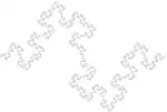 | 1D & 90° | ![]() Courbe quadratique de Koch (type 2) | ![]() Les deux premières itérations. Sa dimension fractale égale 1,5, soit à mi-chemin entre la dimension 1 et la dimension 2. Cette propriété en fait une courbe très utilisée dans l'étude des propriétés physiques des objets fractals (cf. Sapoval). |