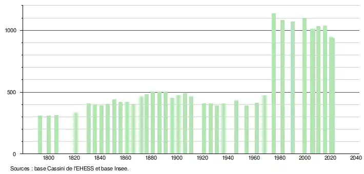 L'évolution du nombre d'habitants est connue à travers les recensements de la population effectués dans la commune depuis 1793. Pour les communes de moins de 10 000 habitants, une enquête de recensement portant sur toute la population est réalisée tous les cinq ans, les populations légales des années intermédiaires étant quant à elles estimées par interpolation ou extrapolation[26]. Pour la commune, le premier recensement exhaustif entrant dans le cadre du nouveau dispositif a été réalisé en 2005[27].