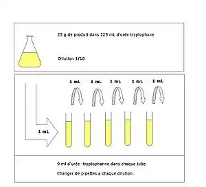 Pour éviter ce problème, il faut effectuer des dilutions successives. La norme est de prélever 25 g de produit de façon homogène que l'on dilue au 10e, avant de le diluer à nouveau dans 225 mL d'urée-tryptophane contenu dans un sac spécial. Comme les micro-organismes peuvent être partout dans l'aliment, l'aliment sera broyé dans une machine.