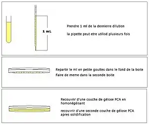 Les gouttes sont ensuite recouvertes d'une couche de gélose PCA en surfusion, et le tout est homogénéisé avec des mouvements circulaires. On s'arrange pour que la gélose ne soit pas trop chaude de façon à ne pas tuer les bactéries.