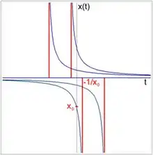 Un exemple[22],[Note 5] est donné par l'équation x' = –x2. La solution s'écrit :