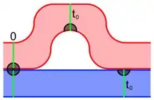 Pour rendre global le résultat précédent de continuité « au voisinage de la diagonale », il reste encore un peu de travail. Il s'agit surtout de montrer que la configuration de droite ne peut pas se produire. En reprenant la métaphore de l'introduction, on suppose que l'étang contient un rocher. Sur la zone rouge, le flot contourne le rocher, sur la zone bleue il passe tout droit. Le flot possède alors des points de discontinuité. Pour s'en rendre compte, on considère l'évolution d'un voisinage d'un point symbolisé par une zone grise circulaire à un instant 0, sur la figure de droite. Ce point est situé à la frontière des deux zones. À l'instant t0, ce voisinage est découpé en deux parties éloignées l'une de l'autre. Cette configuration peut se produire, par exemple si Ω n'est pas un ouvert. En revanche, dans les hypothèses étudiées, cette configuration est impossible :