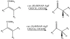 Une autre méthode de synthèse organique utilisant le fluorure d'argent(I) est la protonation énantiosélective d'éther de silylénol catalysée par le complexe BINAP-AgF[22] : :1546