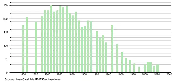 L'évolution du nombre d'habitants est connue à travers les recensements de la population effectués dans la commune depuis 1800. Pour les communes de moins de 10 000 habitants, une enquête de recensement portant sur toute la population est réalisée tous les cinq ans, les populations légales des années intermédiaires étant quant à elles estimées par interpolation ou extrapolation[11]. Pour la commune, le premier recensement exhaustif entrant dans le cadre du nouveau dispositif a été réalisé en 2004[12].