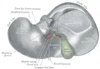 - la fissure sagittale droite (ou sillon sagittal droit) correspond à la fosse de la vésicule biliaire en avant, et au sillon de la veine cave inférieur en arrière ;
