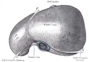 Le foie est divisé en deux lobes séparés par le ligament falciforme (ou ligament suspenseur)[8], le lobe droit (deux tiers du volume du foie) et le lobe gauche (un tiers du volume). On peut également individualiser deux autres lobes mineurs en taille : le lobe caudé (ou lobe de Spiegel) et le lobe carré[9].