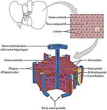 Le foie est constitué de cellules hépatiques (hépatocytes) organisées en travées autour des sinusoïdes (capillaires hautement perméables où le sang circule). L'unité fonctionnelle du foie est le lobule hépatique. Ses échanges avec le reste du corps se font pour la plupart à travers sa double irrigation sanguine (veine porte et artère hépatique propre), qui se termine par une multitude de capillaires jusqu'à l'intérieur du foie. On peut rajouter que plusieurs shunts se font entre le système porte et la veine sus-hépatique.