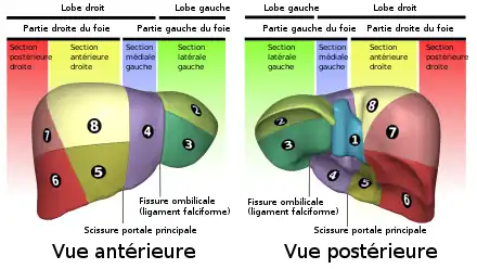 Selon la segmentation hépatique de Couinaud[10], le foie est divisé en secteurs, eux-mêmes divisés en segments.