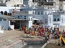 Pushkar est un haut lieu de pèlerinage dans l'hindouisme[1]. Une grande fête religieuse, donnée en l'honneur du dieu Brahma, le dieu de la ville, inaugure ainsi la foire aux chameaux. Au moment de la pleine lune de Kartik Purnima (en) une procession religieuse draine, selon le "Répertoire impérial de l'Inde", cent mille pèlerins qui viennent invoquer et vénérer le dieu Brahma, sur les rives du lac sacré en descendant, par l'un des 52 ghats, afin de s'y baigner[2].