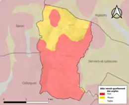 La commune est vulnérable au risque de mouvements de terrains constitué principalement du retrait-gonflement des sols argileux[16]. Cet aléa est susceptible d'engendrer des dommages importants aux bâtiments en cas d’alternance de périodes de sécheresse et de pluie. La totalité de la commune est en aléa moyen ou fort (67,5 % au niveau départemental et 48,5 % au niveau national). Sur les 190 bâtiments dénombrés sur la commune en 2019, 190 sont en aléa moyen ou fort, soit 100 %, à comparer aux 90 % au niveau départemental et 54 % au niveau national. Une cartographie de l'exposition du territoire national au retrait gonflement des sols argileux est disponible sur le site du BRGM[17],[Carte 2].
