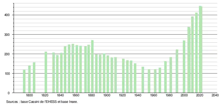 L'évolution du nombre d'habitants est connue à travers les recensements de la population effectués dans la commune depuis 1793. Pour les communes de moins de 10 000 habitants, une enquête de recensement portant sur toute la population est réalisée tous les cinq ans, les populations légales des années intermédiaires étant quant à elles estimées par interpolation ou extrapolation[22]. Pour la commune, le premier recensement exhaustif entrant dans le cadre du nouveau dispositif a été réalisé en 2005[23].