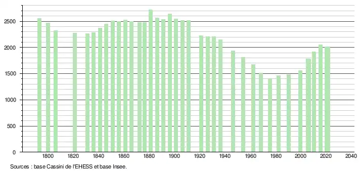 L'évolution du nombre d'habitants est connue à travers les recensements de la population effectués dans la commune depuis 1793. Pour les communes de moins de 10 000 habitants, une enquête de recensement portant sur toute la population est réalisée tous les cinq ans, les populations légales des années intermédiaires étant quant à elles estimées par interpolation ou extrapolation[20]. Pour la commune, le premier recensement exhaustif entrant dans le cadre du nouveau dispositif a été réalisé en 2005[21].