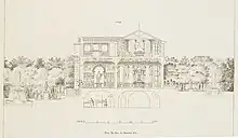 - La chartreuse elle-même, dont l'entrée se faisait désormais sur le côté correspondant au no 20 de la rue Balzac fut vendue le pour 250 000 francs au baron Gudin, peintre de la marine, et son épouse[50]. Ceux-ci s'installèrent dans la chartreuse. Ils agrandirent le domaine par plusieurs acquisitions[51]. Un plan levé le à l'occasion de l'expropriation des terrains sur lesquels allait être percé le boulevard Beaujon[52] montre que la propriété ouvrait alors sur la rue des Écuries-d'Artois par un portail cocher d'où une allée tracée entre deux pelouses conduisait à un premier bâtiment, de peu d'épaisseur, parallèle à la rue. Derrière celui-ci, au fond d'une seconde cour, se trouvait le pavillon construit par Beaujon. Des deux rotondes ajoutées par les Vanlerberghe, seule celle située à l'est avait été conservée. Le côté du pavillon vers l'ouest donnait sur la cour d'entrée du côté de la rue Balzac.